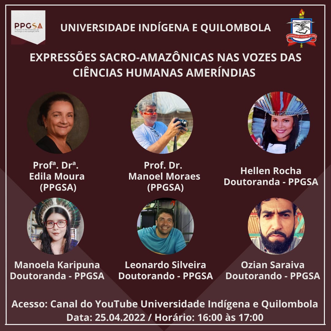 O Programa de Pós-Graduação em Ciências da Religião PPGCR-UEPA, e o Programa de Pós-Graduação em Sociologia e Antropologia, PPGSA-UFPA, convidam para o evento "Universidade Indigena & Quilombola: Expressões Sacro-Amazônicas nas Vozes das Ciências Humanas Ameríndias" que acontecerá nesta segunda-feira dia 25/04